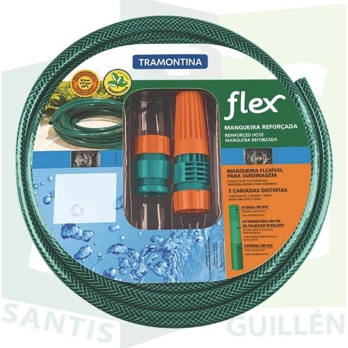 • Para mayor resistencia, tiene tres capas distintas: interna de PVC, intermedia de hilo poliéster trenzado y externa de PVC.